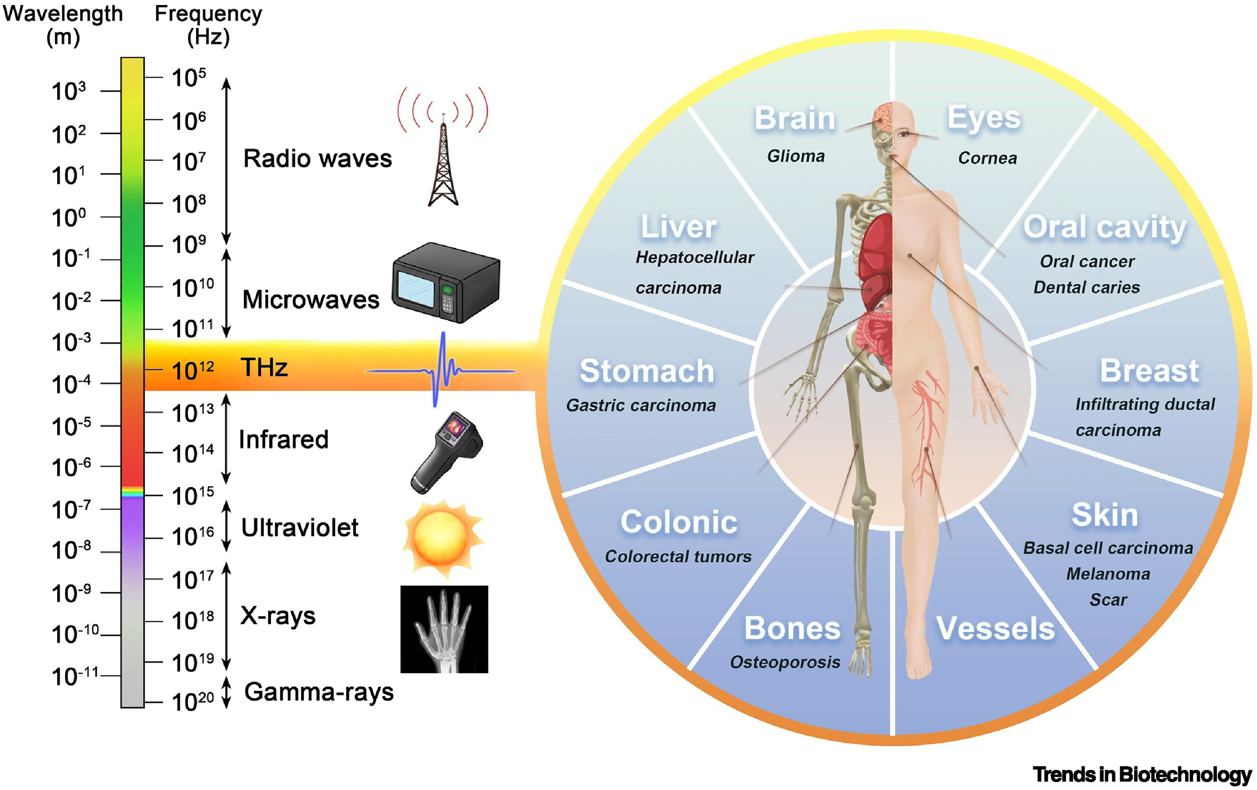 Terahertz waves vibrate at the same frequency as normal body cells. When terahertz waves penetrate the body tissues, they pass through healthy cells at a constant temperature and they cause unhealthy cells to vibrate faster which